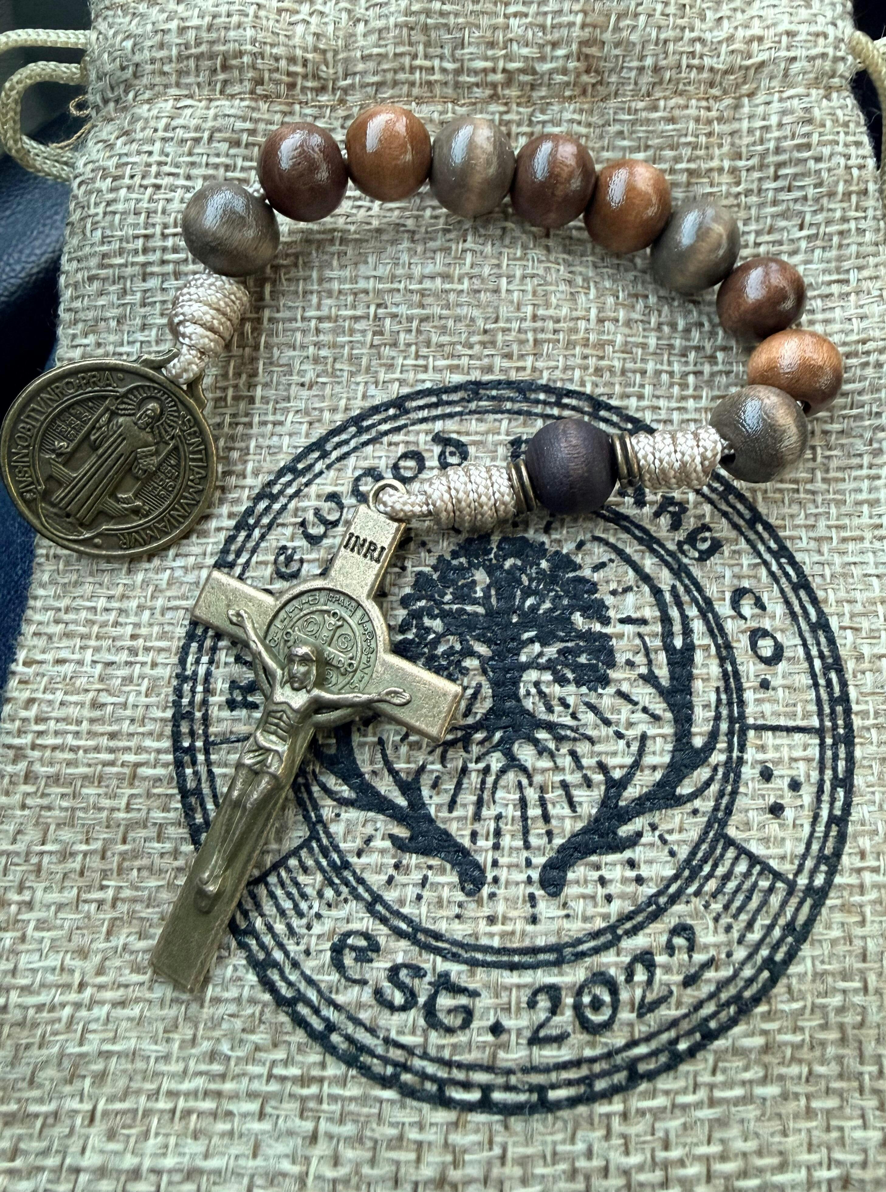 Based on the popular Desert Monk rosary , we are excited to offer a pocket version with bronze hardware. This rosary features a variety of stained brown wood Hail Mary beads and a walnut stained wooden Our Father bead, along with a bronze St. Benedict Crucifix and Miraculous Medal. This pocket rosary is durable and will withstand the rigors of daily use.