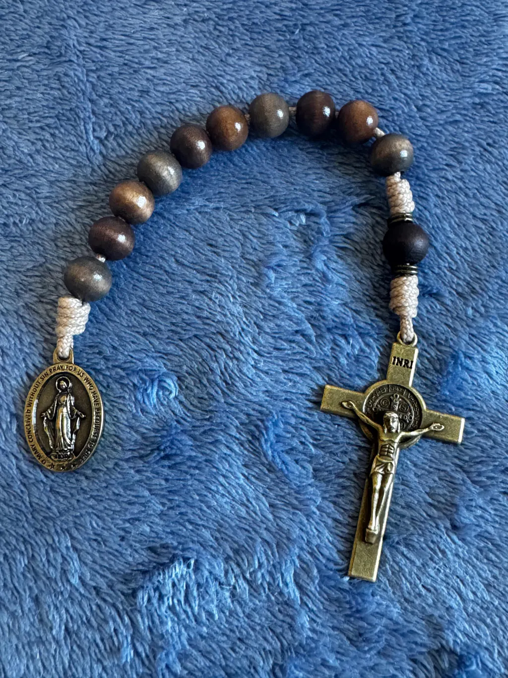 The Desert Monk Rosary is a one-of-a-kind devotional tool, featuring multi-colored brown wooden beads strung on durable desert tan 95 paracord. With a striking copper crucifix and St. Benedict medal centerpiece, this rosary is built to withstand daily prayer. Each wooden bead absorbs the stain differently, making every rosary unique. Crafted with care in Fargo, ND, the Desert Monk Rosary embodies the rugged spirituality that calls us to deeper devotion.