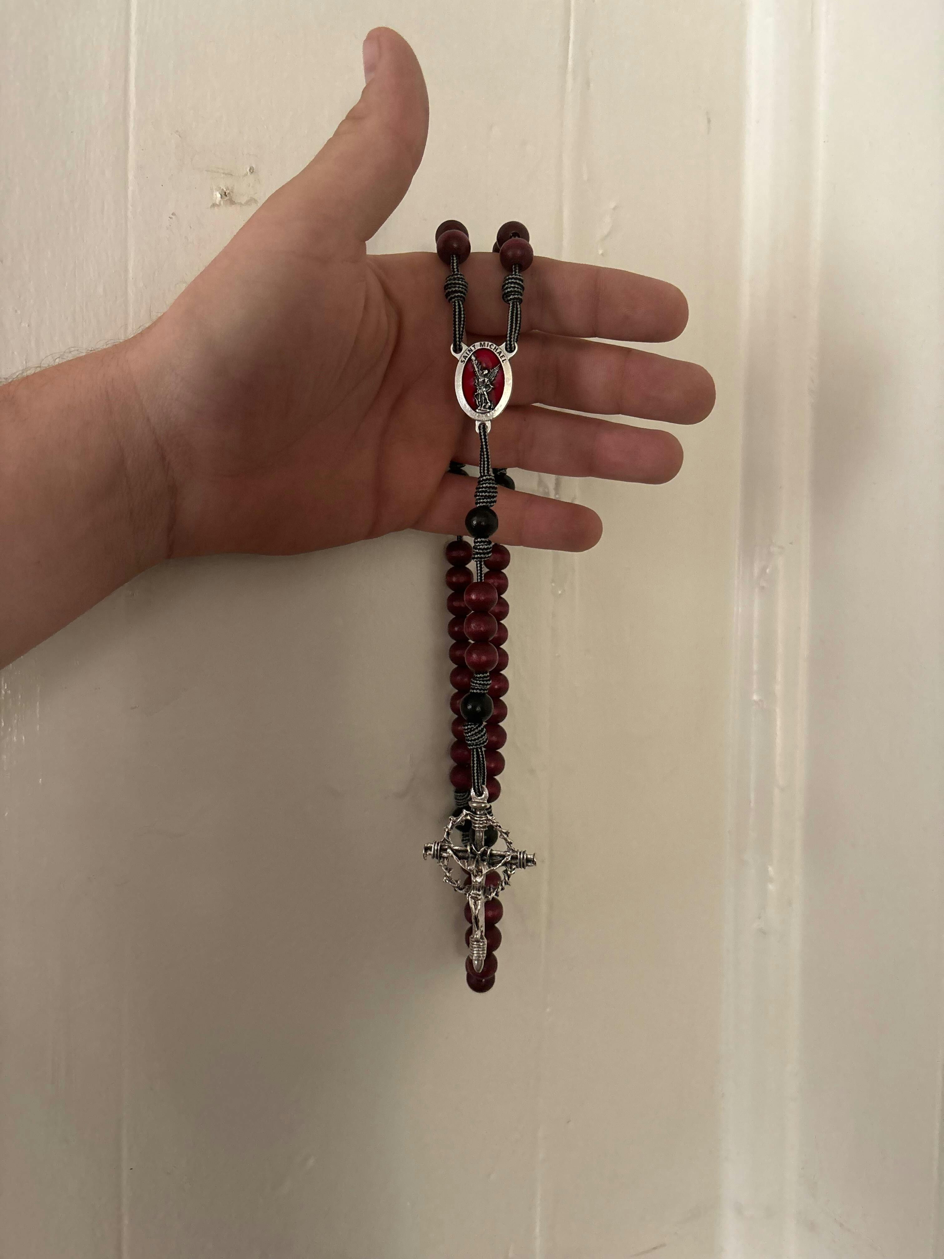 The St. Michael Rosary is a powerful tribute to the Prince of the Heavenly Host, featuring durable 95 paracord and a striking silver oxidized Crown of Thorns crucifix. Red wooden Hail Mary beads and black Our Father beads complete this handcrafted piece, designed to inspire daily prayer and devotion. Made to endure, this rosary is small enough to fit in your pocket, yet strong enough to carry you through your spiritual battles. Each rosary is made with unique beads in our Fargo, ND studio.