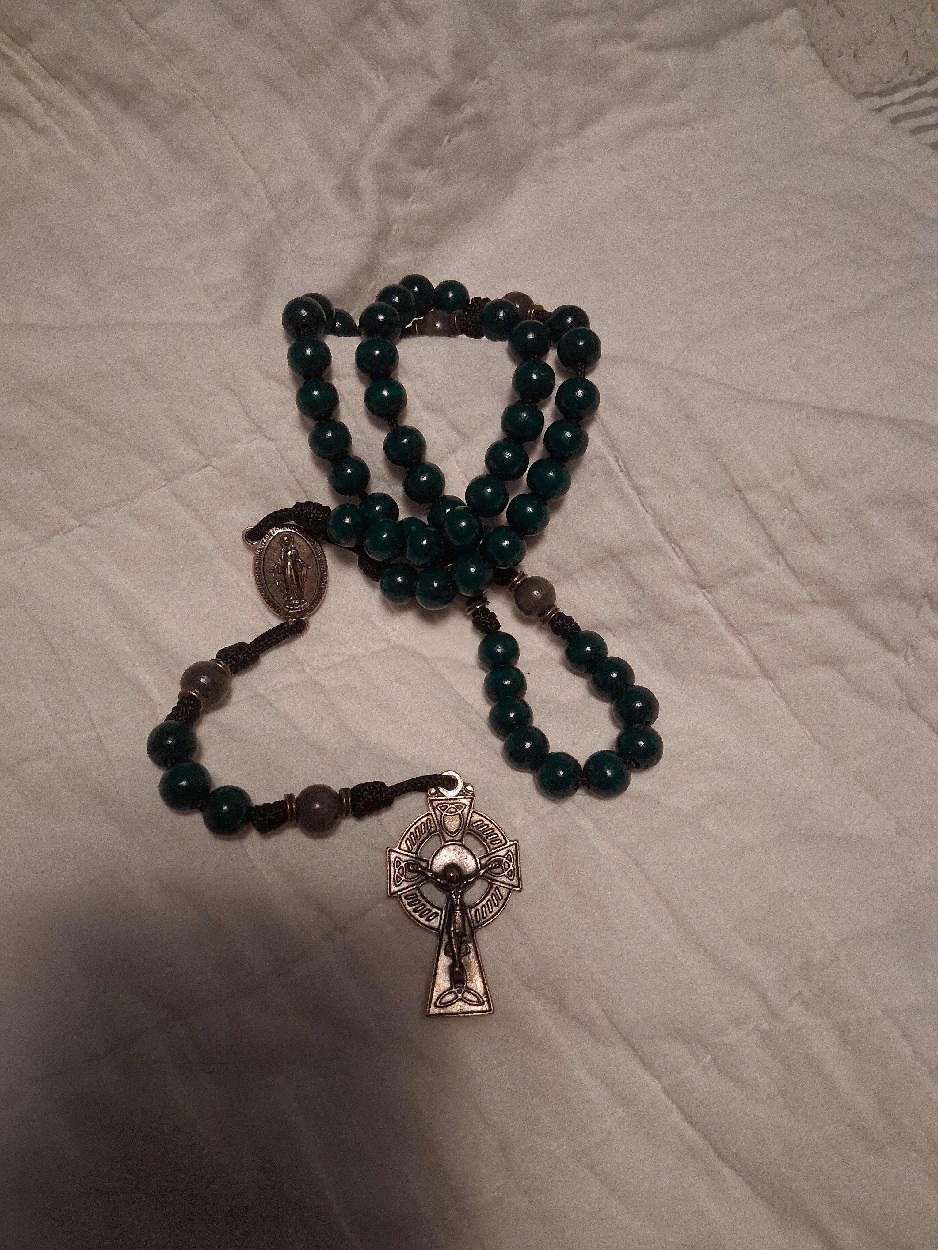 The St. Patrick Rosary is a strong, stunning green rosary honoring the legacy of St. Patrick who brought the Light of Christ into the darkness of pagan Ireland in the 5th Century. Strung on durable black 95 paracord, this handcrafted rosary is built to withstand the rigors of daily prayer. The Bronze Celtic crucifix and Miraculous Medal centerpiece offer both beauty and spiritual protection. Each wood bead absorbs the stain differently, making every rosary unique. Compact and strong, this rosary is lovingly crafted in Fargo, ND, to inspire Catholics in their daily prayer journey.